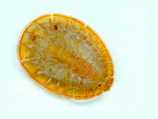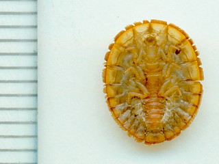 ■背中から見ると甲殻類のようだが、腹から見ると足が三対で昆虫の特徴を持っている。お腹についている白いモヤモヤしたものはエラのようである。