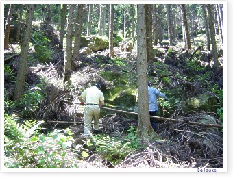 ■杉林下の伏流水がながれる天然の石室の中で、とびきりの吟醸酒はまろやかに熟成していた。人が一人ようやくは入れるくらいの穴の中から、今年飲む分を丁寧に取り出すと、石室はまた封印された。
