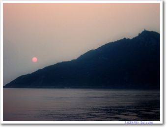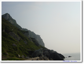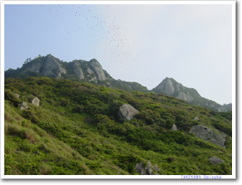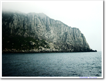 ■早朝、垂直に立ち上がる荒々しい岩壁が霧の中に浮かび上がった。神の島だ。岩は遙か数十メートル頭上から覆い被さるように海に突き出ていた。島の周りには無数の海鳥が舞っていた。岩をおおう原生林は、透明度の高い水面に青く濃いかげを落としている。その圧倒的な存在感。