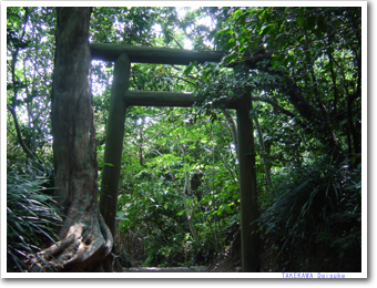 ■「お祓いもしますか?」スニーカーをはきながら若い神官さんは尋ねた。どうしたものかと思いながら曖昧にうなずく。「ではお宮に参りましょう」。島の周囲は崖になっており一筋の階段が森に向かってのびている。一の鳥居をくぐり木陰の山道を登っていく。細い篠竹の藪が揺れるたびに鳥が騒ぐ。このあたりを流れる黒潮の影響だろうか。森の中は妙に湿度が高い。虫たちが羽音を立てて忙しく飛び交う。生き物の気配をそこかしこに感じる。きれいに掃き清められた参道を上り続けると、やがて巨大な岩と老齢の木々に挟まれような形で苔生した社が現れた。沖津宮である。