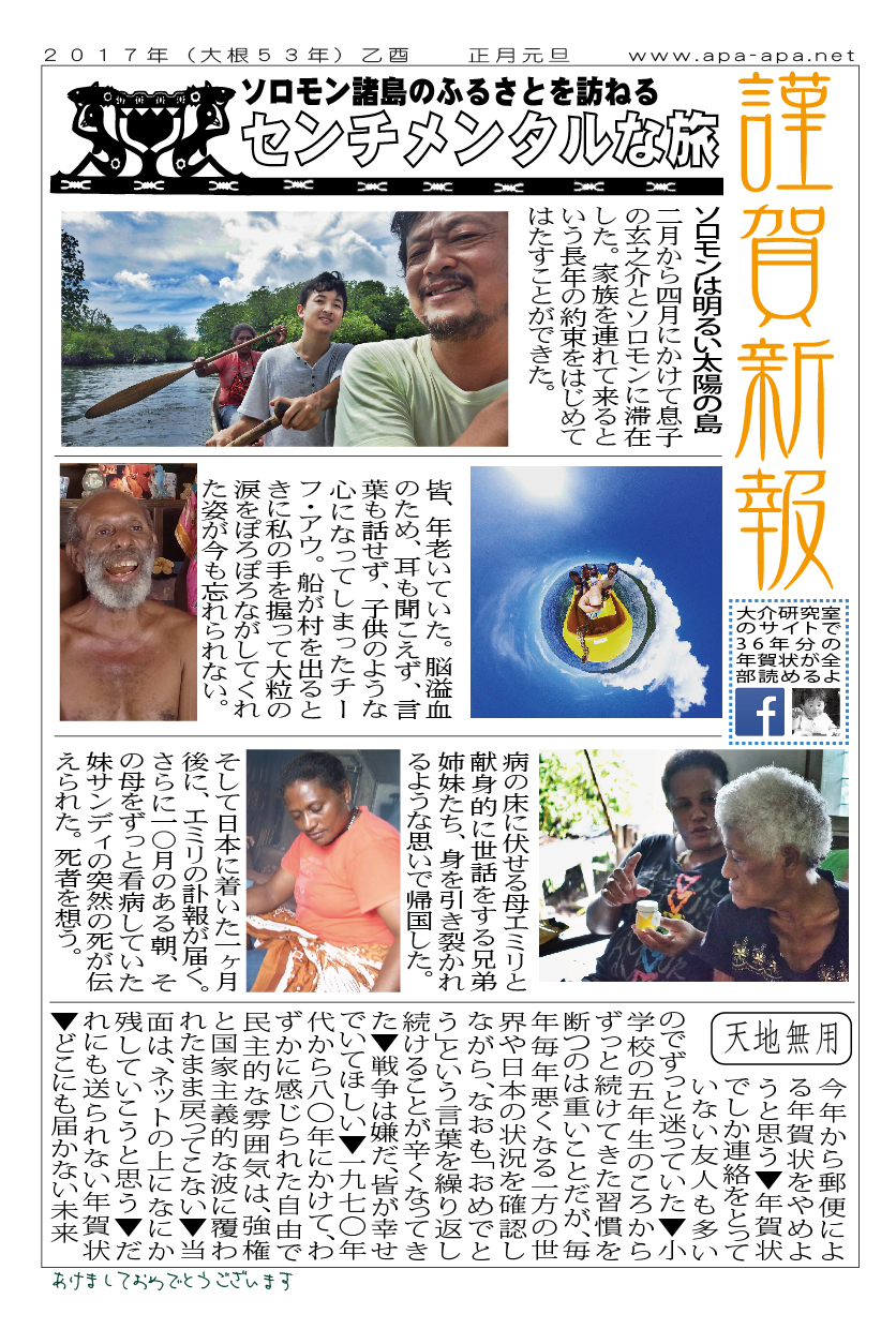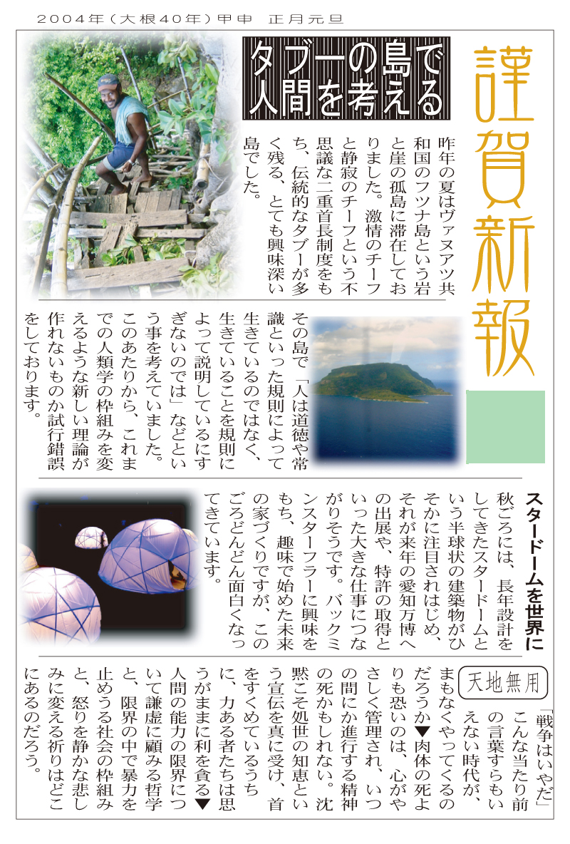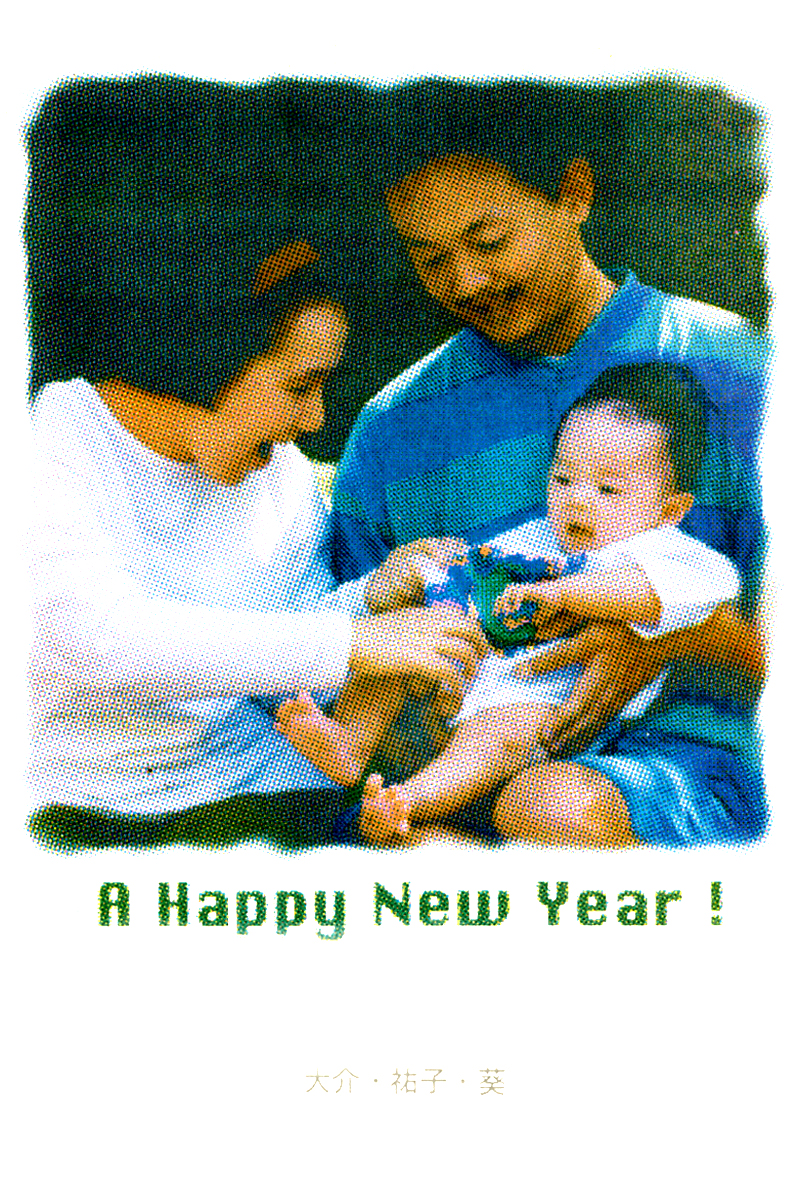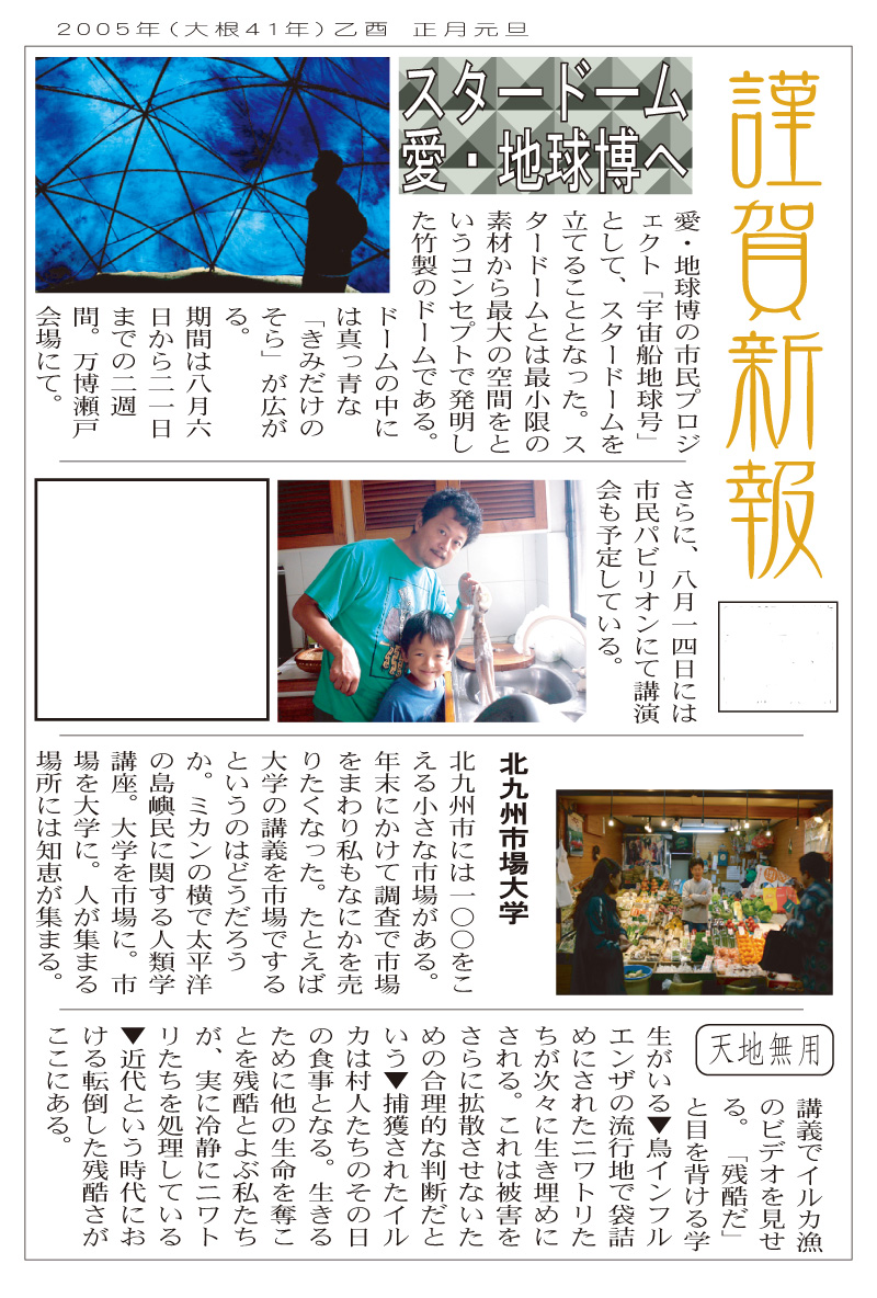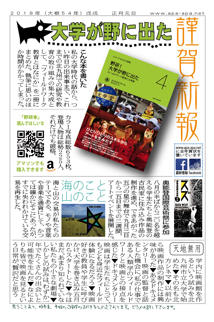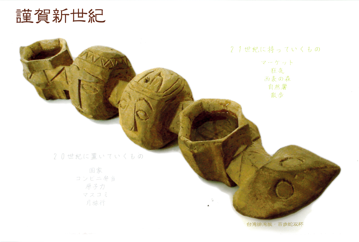 現存するもっとも古い年賀状。ゴムの版画で作られている。 図柄に暗号が隠されている。高校暗黒時代。 犬の足形は本物だろうか。シンプルなデザインを追求する。 銅鐸のイノシシの図柄。まいとし画材を変える。この年はマーカー。 「ね」はねずみのね。浪人の時代 中島みゆきをよく聴いてたころ。 大介マンガを売っていたころ 探検部の年賀状 マウスが一般化し、初めてパソコンでかいたグラフィック 電車でGOGOの年賀状 結婚式の案内の封筒 競馬がはやっていたころ。有馬記念の出馬表が白で印刷されている 沖縄へ調査にいっていた。イラブチャは海のオウムだ。大学院で人類学をまなんでいたころ アウトラインフォント登場。キヌガワ印刷の軽オフを借りて、自分で印刷した。 引っ越しのご案内。なぜかイラストはヤドカリではなくヤシガニ。 簡易軽オフでどこまでカラー印刷ができるか製版に挑戦した作品。あおいが生まれたころ。 初めてのインクジェットプリンタによる作品。京都を離れる冬。 手作りのぬいぐるみ タイガーバームをそのままスキャンした。小倉の生活が始まる 暗い00(ゼロ)年代を予言する。 CGをつかった写真。イギリスのつちのこ 台湾の双杯・百歩蛇がモチーフ ロンドン動物園で見た、もっとも破壊的な動物。破壊の時代が始まる。 心を管理するやさしい時代が始まる 謹賀新報の創刊号・イラストレータを使ったデザイン スタードームが世界に広がりはじめる 日本の階層格差の広がりが容認されていく。就活という名で大学が学問を放棄し職安化する。 不審者という言葉がはやり根拠のない不安がばらまかれる。 プトンギプロジェクトが始まる。昔を思い出し時代を感じる。 旦過の大學堂が一年を迎える。日々、多忙を極める。 大學堂に画廊を持つ。本を書きたい。 原発が壊れる。近くのものが見えにくくなる。<クリックで拡大> 他者への想像力の低下が気になる。マッチョな乱暴者が人気。 日本がいよいよ崩れ始める。私はもたもたしている。 みつばちにはまっている。 サバティカルでチベットに行った。 郵便による年賀状をやめようと思う 野研の本を出し国際芸術祭に参加した アメリカのいうなりに戦争への準備がすすんでいく