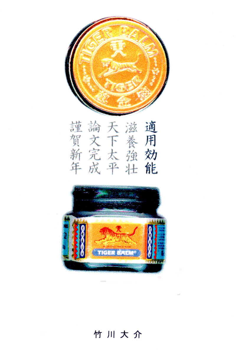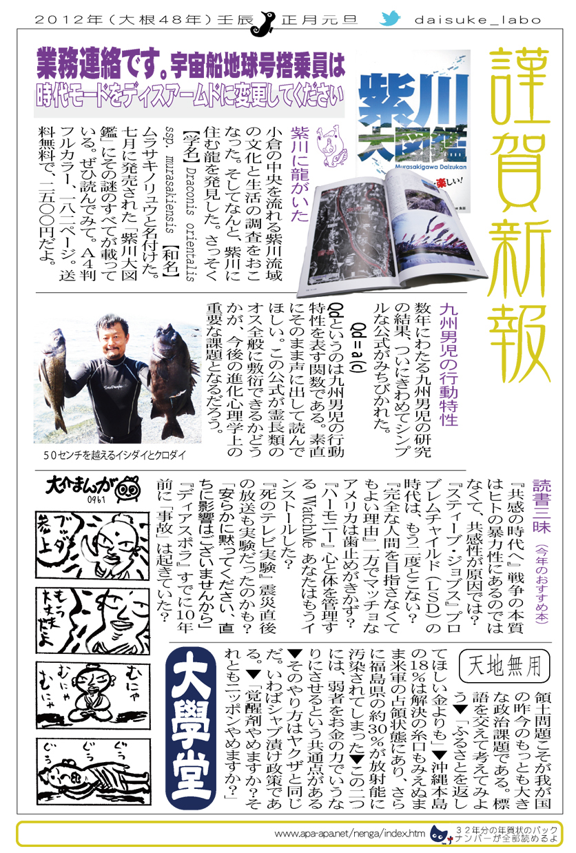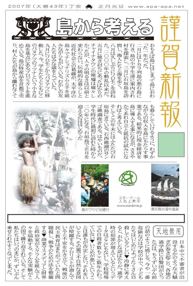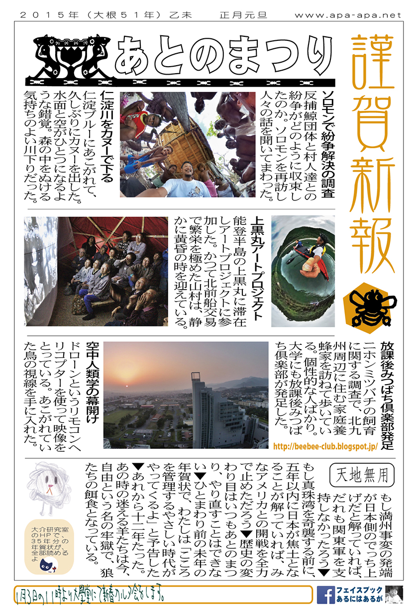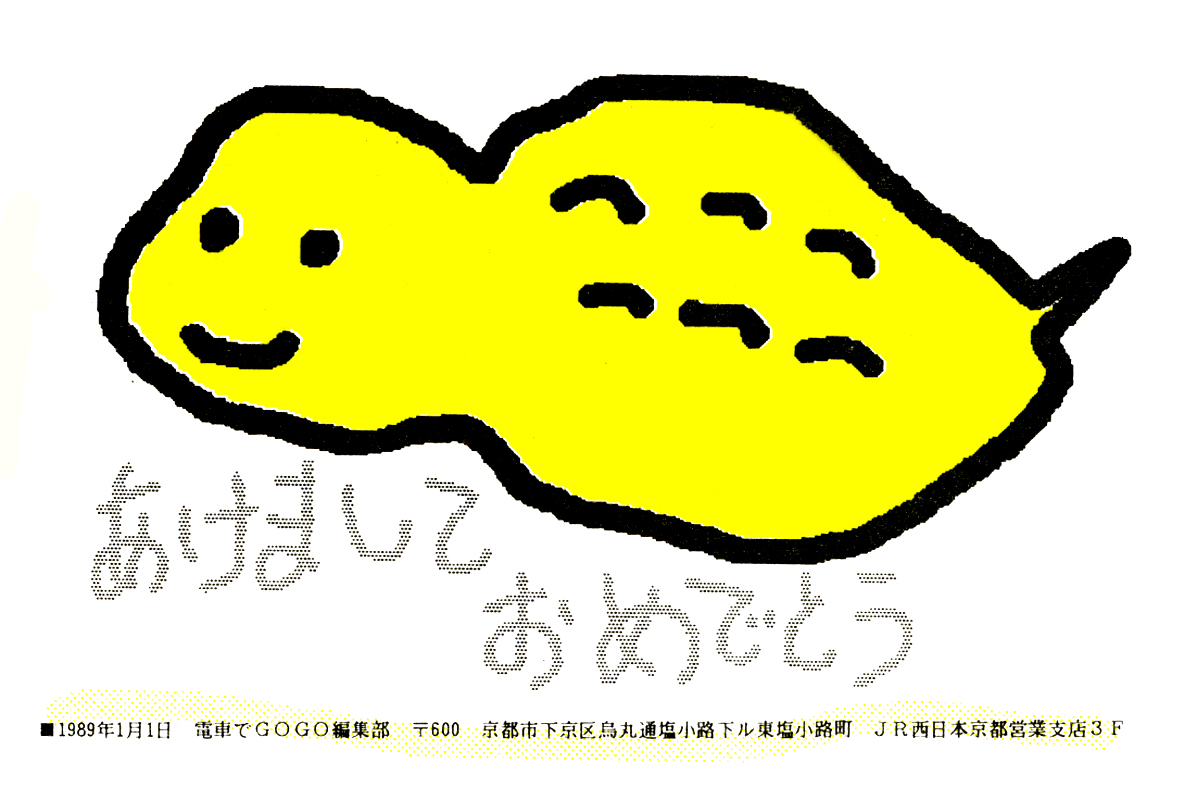 現存するもっとも古い年賀状。ゴムの版画で作られている。 図柄に暗号が隠されている。高校暗黒時代。 犬の足形は本物だろうか。シンプルなデザインを追求する。 銅鐸のイノシシの図柄。まいとし画材を変える。この年はマーカー。 「ね」はねずみのね。浪人の時代 中島みゆきをよく聴いてたころ。 大介マンガを売っていたころ 探検部の年賀状 マウスが一般化し、初めてパソコンでかいたグラフィック 電車でGOGOの年賀状 結婚式の案内の封筒 競馬がはやっていたころ。有馬記念の出馬表が白で印刷されている 沖縄へ調査にいっていた。イラブチャは海のオウムだ。大学院で人類学をまなんでいたころ アウトラインフォント登場。キヌガワ印刷の軽オフを借りて、自分で印刷した。 引っ越しのご案内。なぜかイラストはヤドカリではなくヤシガニ。 簡易軽オフでどこまでカラー印刷ができるか製版に挑戦した作品。あおいが生まれたころ。 初めてのインクジェットプリンタによる作品。京都を離れる冬。 手作りのぬいぐるみ タイガーバームをそのままスキャンした。小倉の生活が始まる 暗い00(ゼロ)年代を予言する。 CGをつかった写真。イギリスのつちのこ 台湾の双杯・百歩蛇がモチーフ ロンドン動物園で見た、もっとも破壊的な動物。破壊の時代が始まる。 心を管理するやさしい時代が始まる 謹賀新報の創刊号・イラストレータを使ったデザイン スタードームが世界に広がりはじめる 日本の階層格差の広がりが容認されていく。就活という名で大学が学問を放棄し職安化する。 不審者という言葉がはやり根拠のない不安がばらまかれる。 プトンギプロジェクトが始まる。昔を思い出し時代を感じる。 旦過の大學堂が一年を迎える。日々、多忙を極める。 大學堂に画廊を持つ。本を書きたい。 原発が壊れる。近くのものが見えにくくなる。<クリックで拡大> 他者への想像力の低下が気になる。マッチョな乱暴者が人気。 日本がいよいよ崩れ始める。私はもたもたしている。 みつばちにはまっている。 サバティカルでチベットに行った。 郵便による年賀状をやめようと思う 野研の本を出し国際芸術祭に参加した アメリカのいうなりに戦争への準備がすすんでいく