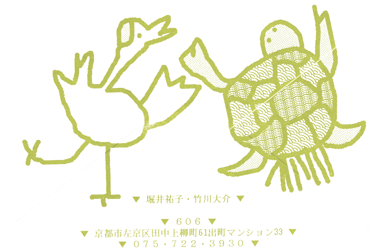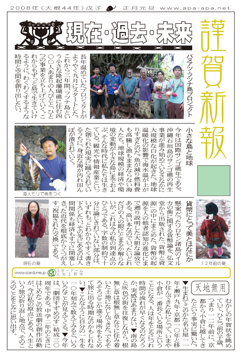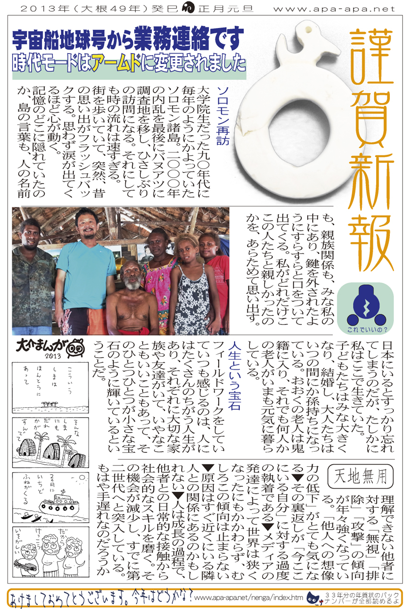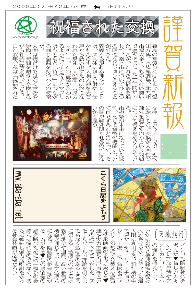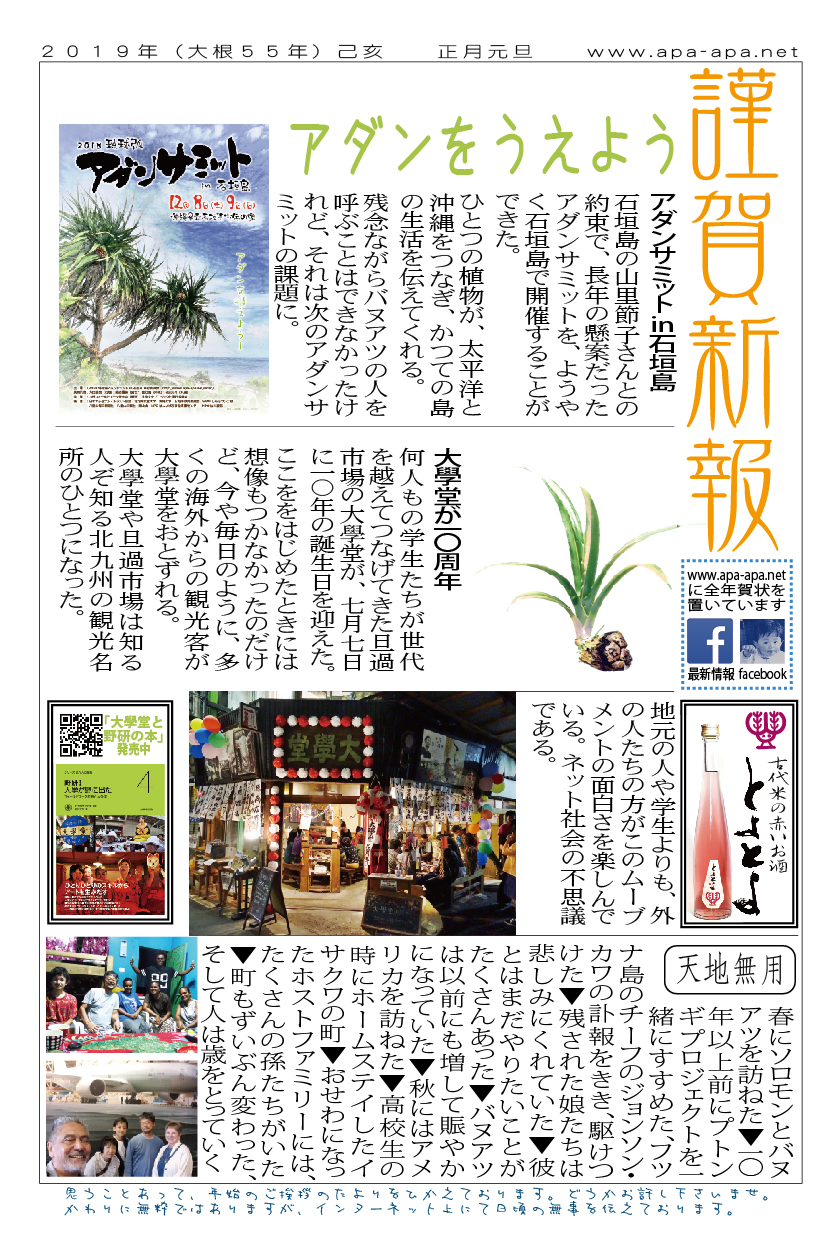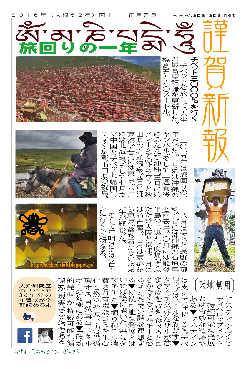 現存するもっとも古い年賀状。ゴムの版画で作られている。 図柄に暗号が隠されている。高校暗黒時代。 犬の足形は本物だろうか。シンプルなデザインを追求する。 銅鐸のイノシシの図柄。まいとし画材を変える。この年はマーカー。 「ね」はねずみのね。浪人の時代 中島みゆきをよく聴いてたころ。 大介マンガを売っていたころ 探検部の年賀状 マウスが一般化し、初めてパソコンでかいたグラフィック 電車でGOGOの年賀状 結婚式の案内の封筒 競馬がはやっていたころ。有馬記念の出馬表が白で印刷されている 沖縄へ調査にいっていた。イラブチャは海のオウムだ。大学院で人類学をまなんでいたころ アウトラインフォント登場。キヌガワ印刷の軽オフを借りて、自分で印刷した。 引っ越しのご案内。なぜかイラストはヤドカリではなくヤシガニ。 簡易軽オフでどこまでカラー印刷ができるか製版に挑戦した作品。あおいが生まれたころ。 初めてのインクジェットプリンタによる作品。京都を離れる冬。 手作りのぬいぐるみ タイガーバームをそのままスキャンした。小倉の生活が始まる 暗い00(ゼロ)年代を予言する。 CGをつかった写真。イギリスのつちのこ 台湾の双杯・百歩蛇がモチーフ ロンドン動物園で見た、もっとも破壊的な動物。破壊の時代が始まる。 心を管理するやさしい時代が始まる 謹賀新報の創刊号・イラストレータを使ったデザイン スタードームが世界に広がりはじめる 日本の階層格差の広がりが容認されていく。就活という名で大学が学問を放棄し職安化する。 不審者という言葉がはやり根拠のない不安がばらまかれる。 プトンギプロジェクトが始まる。昔を思い出し時代を感じる。 旦過の大學堂が一年を迎える。日々、多忙を極める。 大學堂に画廊を持つ。本を書きたい。 原発が壊れる。近くのものが見えにくくなる。<クリックで拡大> 他者への想像力の低下が気になる。マッチョな乱暴者が人気。 日本がいよいよ崩れ始める。私はもたもたしている。 みつばちにはまっている。 サバティカルでチベットに行った。 郵便による年賀状をやめようと思う 野研の本を出し国際芸術祭に参加した アメリカのいうなりに戦争への準備がすすんでいく