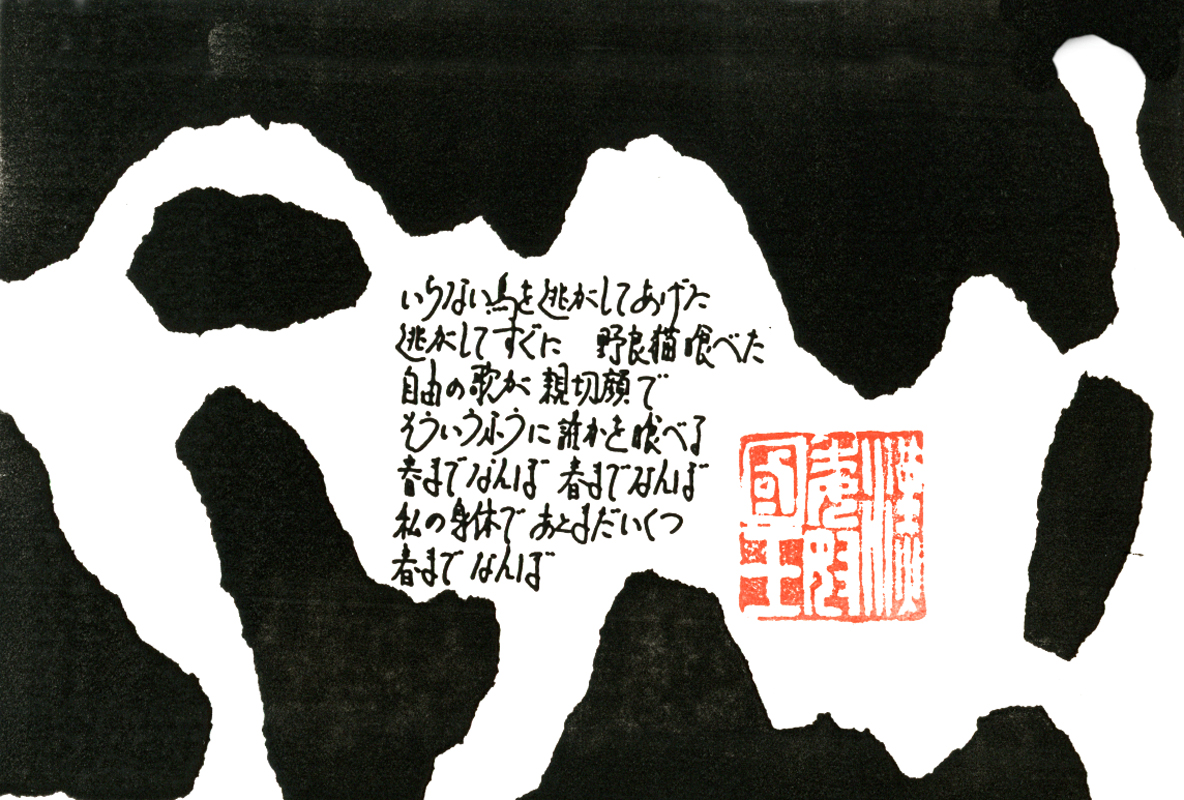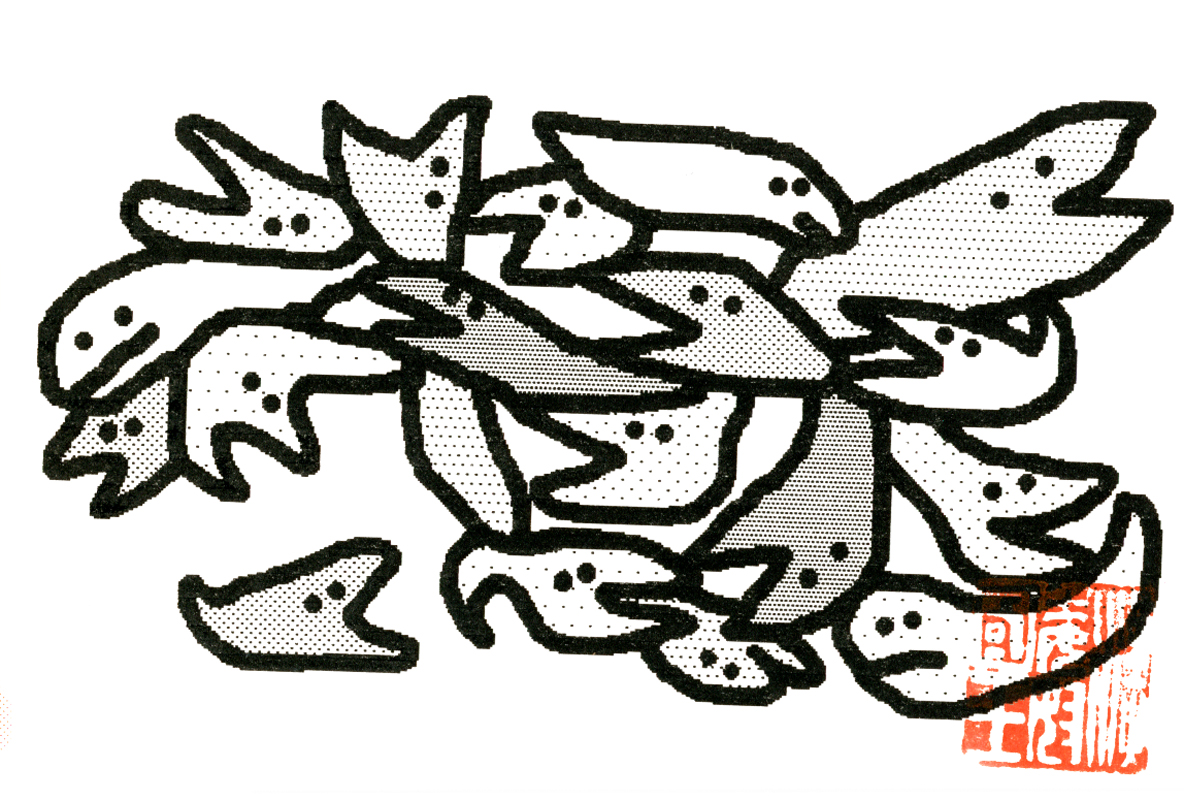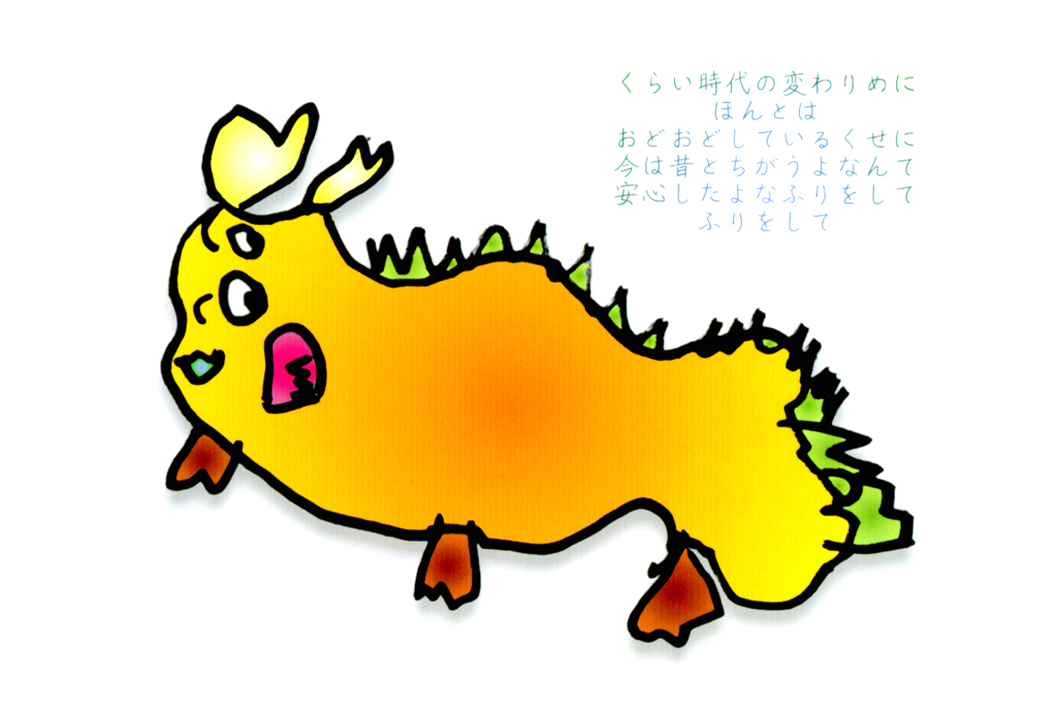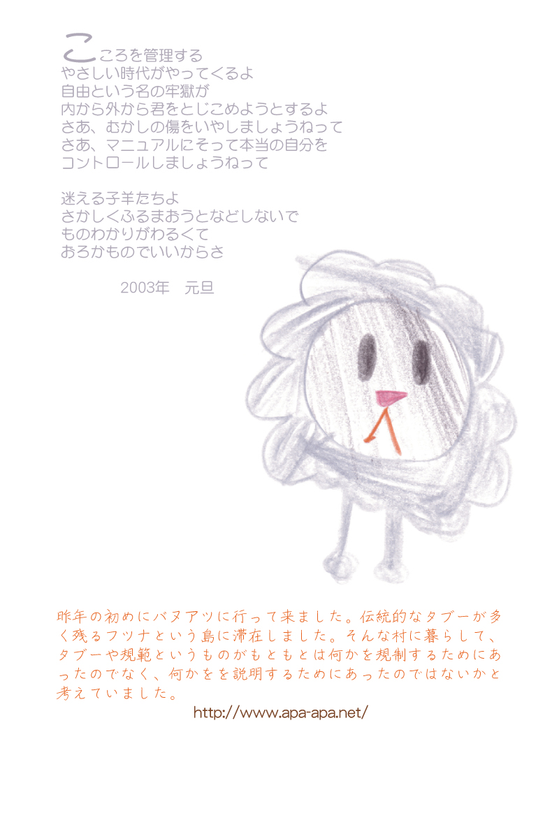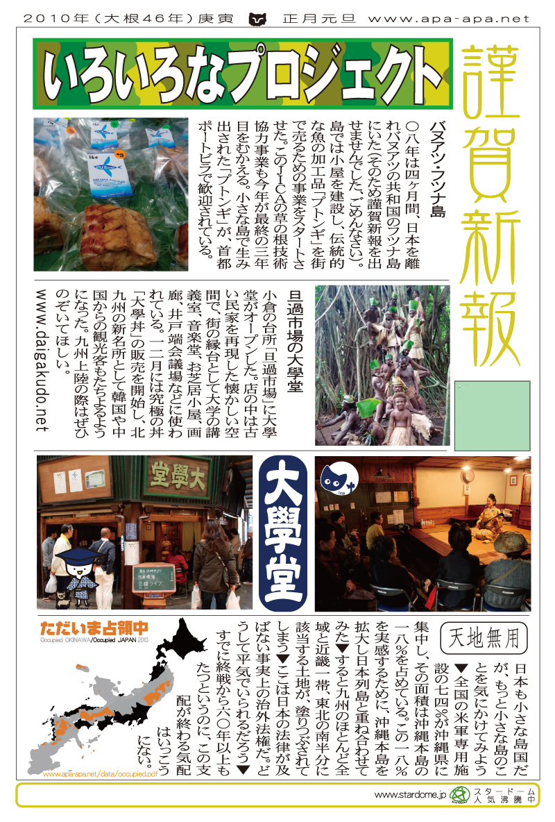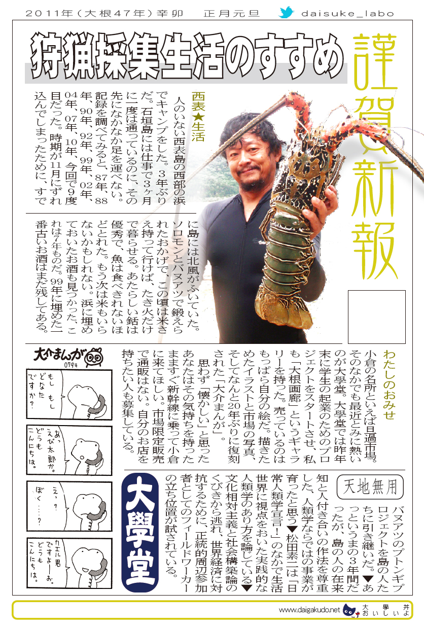 現存するもっとも古い年賀状。ゴムの版画で作られている。 図柄に暗号が隠されている。高校暗黒時代。 犬の足形は本物だろうか。シンプルなデザインを追求する。 銅鐸のイノシシの図柄。まいとし画材を変える。この年はマーカー。 「ね」はねずみのね。浪人の時代 中島みゆきをよく聴いてたころ。 大介マンガを売っていたころ 探検部の年賀状 マウスが一般化し、初めてパソコンでかいたグラフィック 電車でGOGOの年賀状 結婚式の案内の封筒 競馬がはやっていたころ。有馬記念の出馬表が白で印刷されている 沖縄へ調査にいっていた。イラブチャは海のオウムだ。大学院で人類学をまなんでいたころ アウトラインフォント登場。キヌガワ印刷の軽オフを借りて、自分で印刷した。 引っ越しのご案内。なぜかイラストはヤドカリではなくヤシガニ。 簡易軽オフでどこまでカラー印刷ができるか製版に挑戦した作品。あおいが生まれたころ。 初めてのインクジェットプリンタによる作品。京都を離れる冬。 手作りのぬいぐるみ タイガーバームをそのままスキャンした。小倉の生活が始まる 暗い00(ゼロ)年代を予言する。 CGをつかった写真。イギリスのつちのこ 台湾の双杯・百歩蛇がモチーフ ロンドン動物園で見た、もっとも破壊的な動物。破壊の時代が始まる。 心を管理するやさしい時代が始まる 謹賀新報の創刊号・イラストレータを使ったデザイン スタードームが世界に広がりはじめる 日本の階層格差の広がりが容認されていく。就活という名で大学が学問を放棄し職安化する。 不審者という言葉がはやり根拠のない不安がばらまかれる。 プトンギプロジェクトが始まる。昔を思い出し時代を感じる。 旦過の大學堂が一年を迎える。日々、多忙を極める。 大學堂に画廊を持つ。本を書きたい。 原発が壊れる。近くのものが見えにくくなる。<クリックで拡大> 他者への想像力の低下が気になる。マッチョな乱暴者が人気。 日本がいよいよ崩れ始める。私はもたもたしている。 みつばちにはまっている。 サバティカルでチベットに行った。 郵便による年賀状をやめようと思う 野研の本を出し国際芸術祭に参加した アメリカのいうなりに戦争への準備がすすんでいく